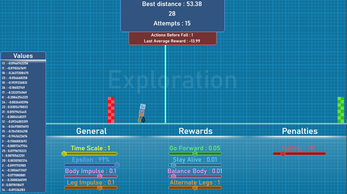 Les paramètres peuvent êtres modifiés dans le but d'entraîner plus ou moins efficacement notre agent à se déplacer vers la droite en marchant.